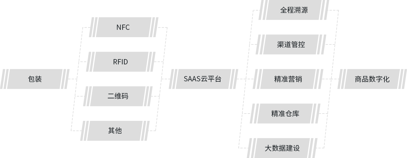 智慧包装一体化、通过包装为载体,植入防伪特征、二维码、RFID等技术